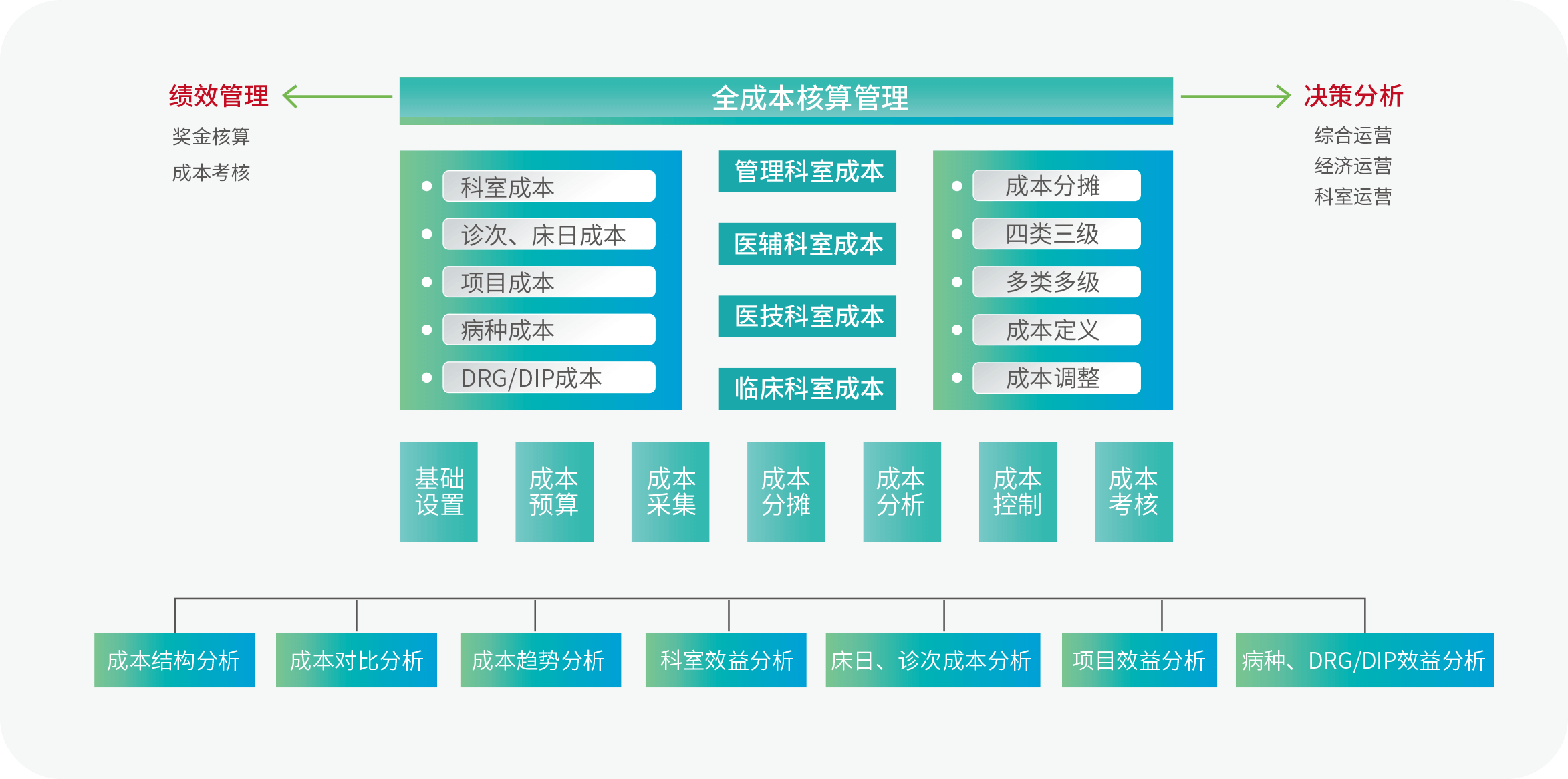成本核算管理系统遵循最新的制度要求,以成本运营计划为起点、成本控制为主要目的,以科室成本为基础,向医疗服务项目成本、病种成本、DRG/DIP成本的精细化核算延伸,同时从业务源头采集真实客观数据,通过建立规范的、符合医院管理要求的多种分摊体系,精准核算各类成本,帮助医院管理者和科室管理者科学决策,明确成本构成、优化成本投入,提高医院运营管理水平,增强医院的核心竞争力,保障医院的可持续发展。