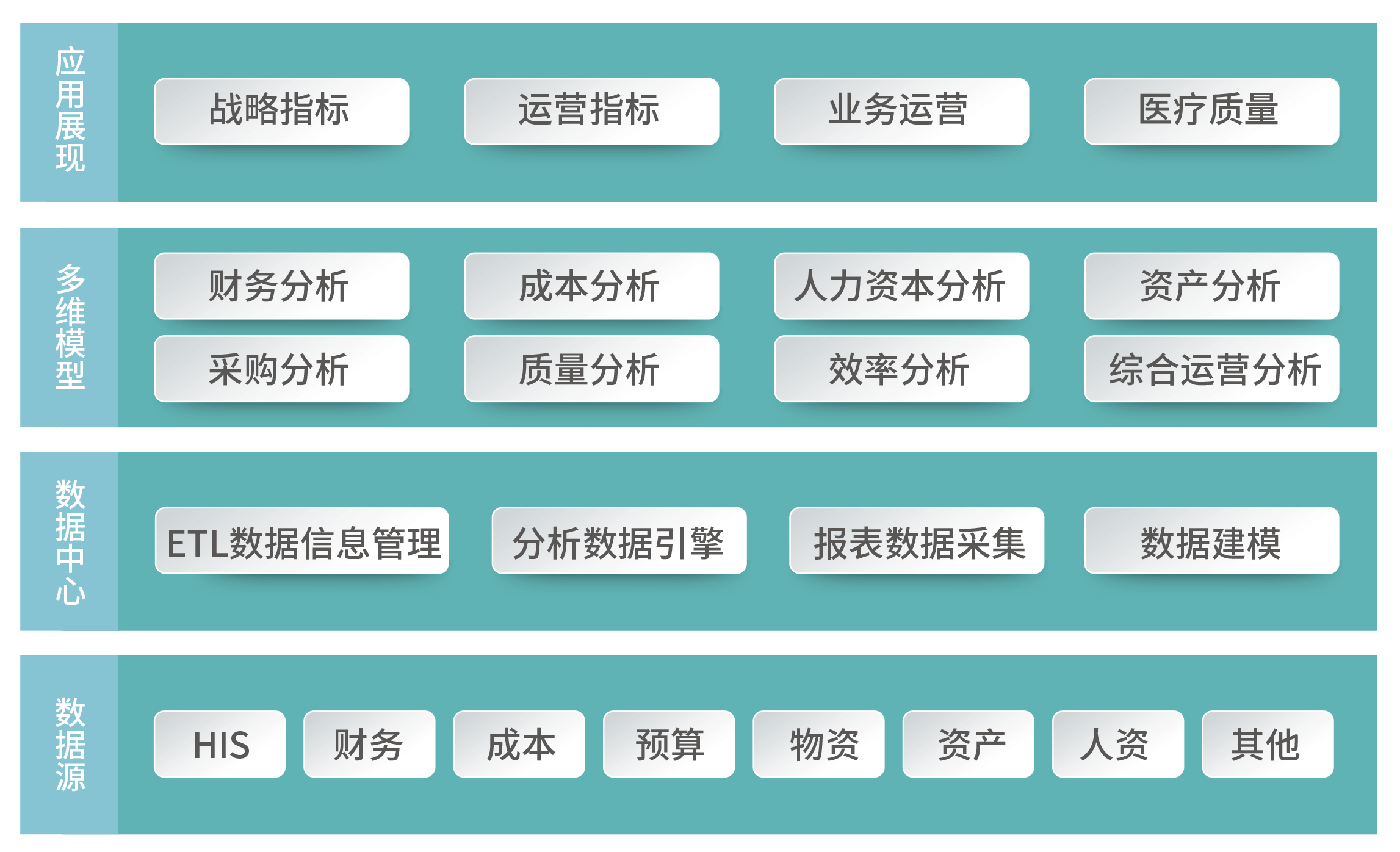 决策分析平台以医疗卫生行业的整体数据架构(数据模型、数据构成、数据关系)为基础和标准,以对应的医疗业务数据为源头,通过决策分析平台,形成针对医院中不同科室、角色和业务活动的智能化应用,为用户提供数据抽取、数据转换、业务分析、数据挖掘、数据图形化展现等功能的同时,还能够为用户提供主动预警、指标监控、趋势分析、问题跟踪,实现全方位、多维度、多层次的个性化用户数据展示,帮助决策者提高决策水平和质量,最终辅助医院战略目标合理化落地。