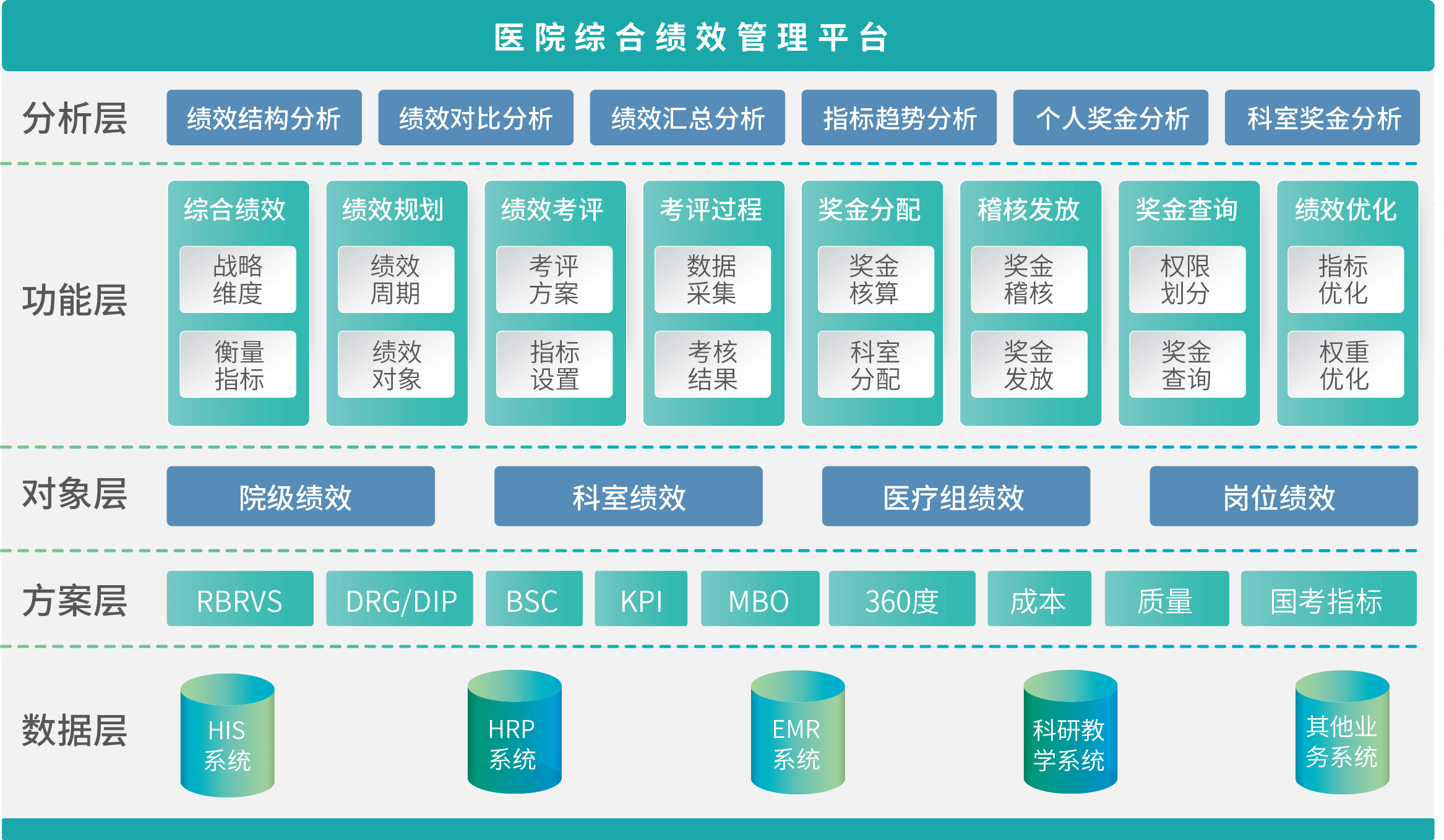 系统支持多种主流考核模型如RBRVS、平衡记分卡(BSC)、KPI(关键绩效指标)、360度、MBO(目标管理)等考核体系,同时针对绩效分配采用效益法、比例法、工作量法、综合法等多种分配模式,实现院、科、组、人等多级的绩效分配体系,广泛适应不同医院对绩效管理的个性化需求。