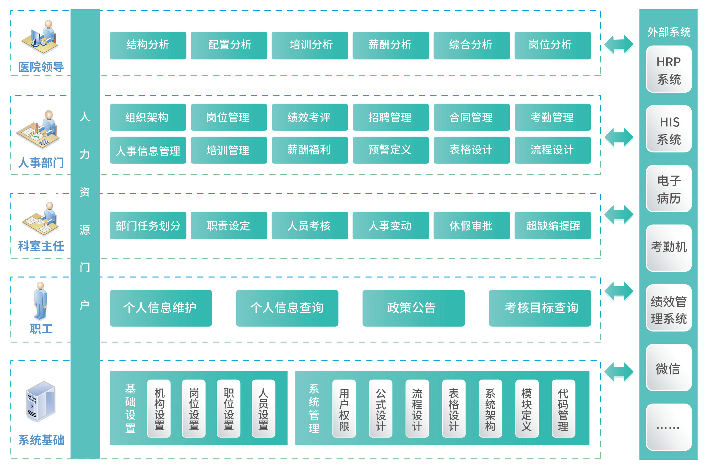 人力资源管理系统建立覆盖全院医生、护士、技师、管理、后勤等各种岗位的动态人力资源管理体系,以人员岗位为核心,涵盖人员招聘、人事合同、人事档案、人员培训、考勤休假、绩效考核、薪酬保险、人力资源决策等各个层面的管理细节。帮助医院建立人员档案,进行能力素质与工作岗位匹配,设计职业发展路线,将合适的人员放在合适的位置上;员工、科室领导与医院领导均能够在系统中完成日常管理的协同,比如请假、招聘、人员变更等,极大提升工作效率;并与业务系统集成,抽取人员在医院完成的工作成果,发现潜在的问题及其可以改进的空间,制定人员培训、素质提升计划并付诸实施。最终实现选、用、育、留、考全方位管理,提升人力资源价值,达到以人为本的管理,帮助医院健康发展。