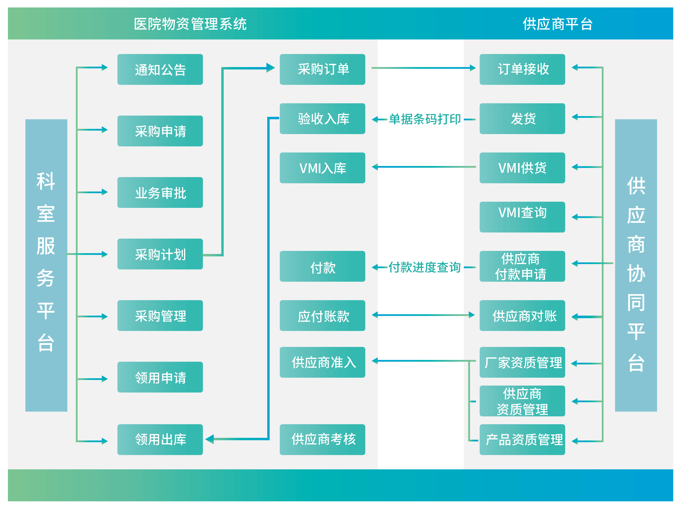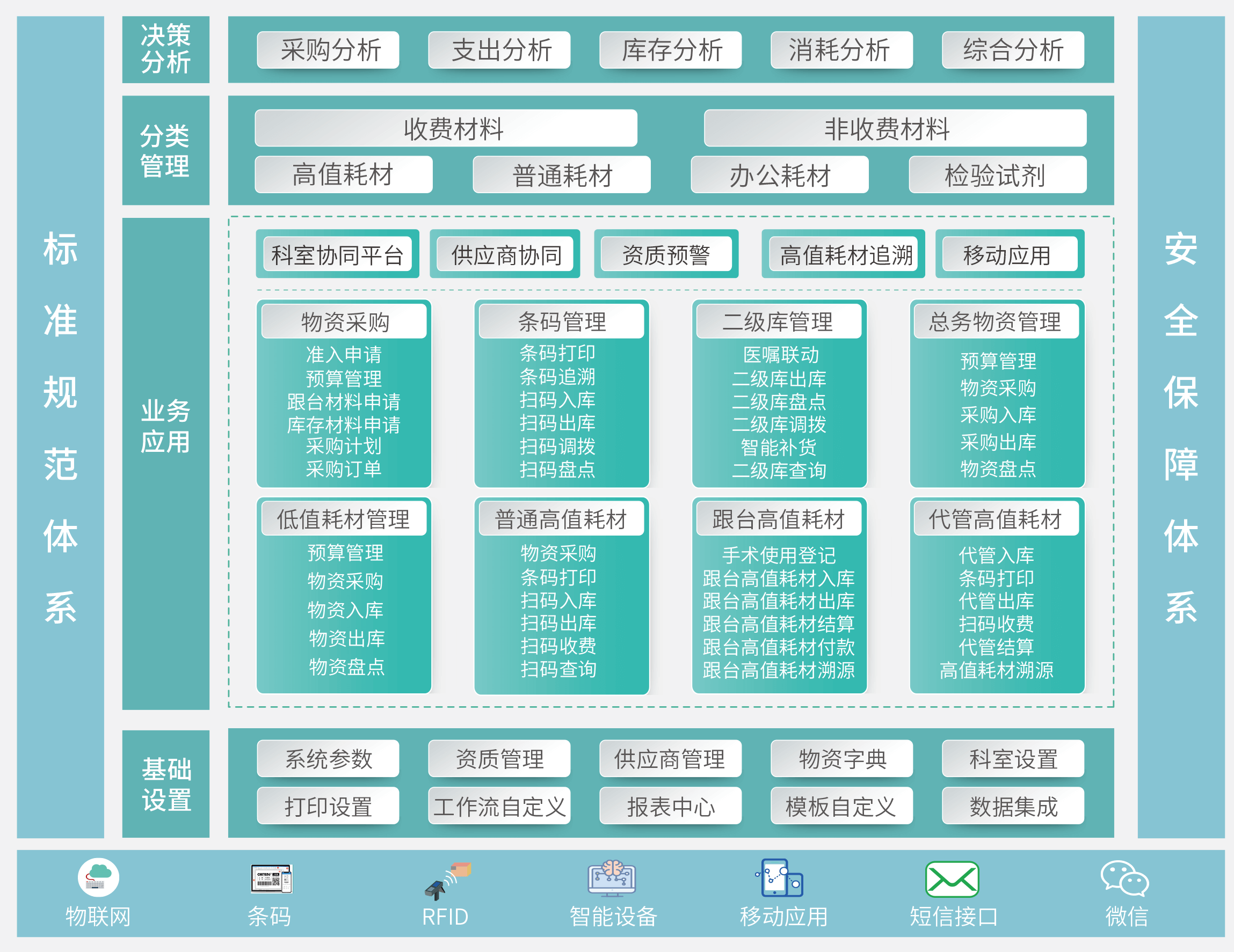 物资管理系统引入全程供应链管理理念,通过供应商协同平台、科室物资服务平台的建立,打通供应商、使用科室、物资主管部门、库房、财务等业务关联单位及科室的联系,构建医院物资全程供应链管理系统。有效提升医院物资管理水平,全面保障医疗物资供应的安全高效。
