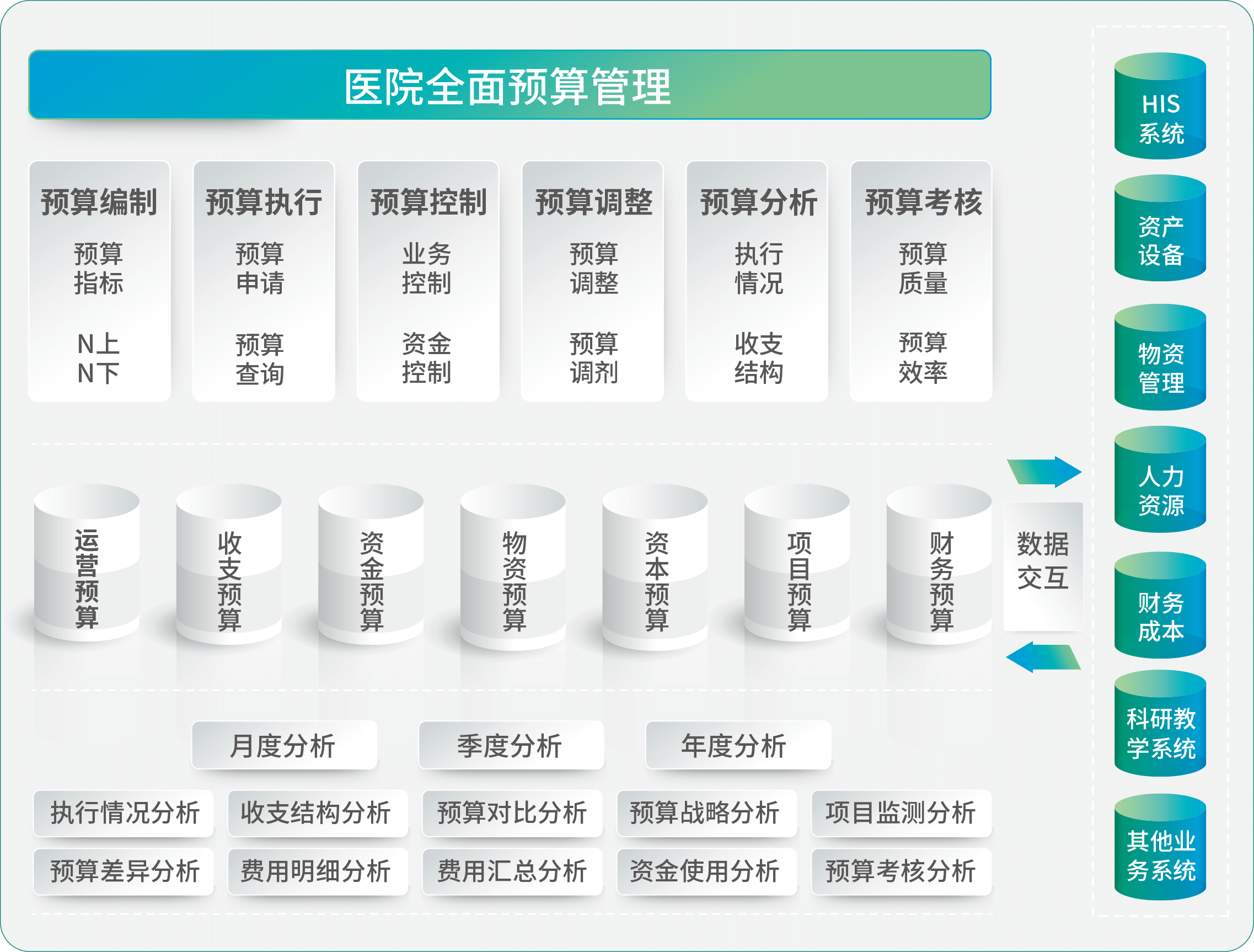 全面预算管理系统旨在帮助医院建立“编、管、控”于一体的全面预算管理体系。涵盖预算的全方位、全流程的管理,将医院的收入预算、支出预算、物资预算、资本预算、项目预算、财务预算及运营指标预算等进行全覆盖,同时对预算的全过程进行信息化管控,实现预算编制科学化,预算管控实时化,预算分析数字化。