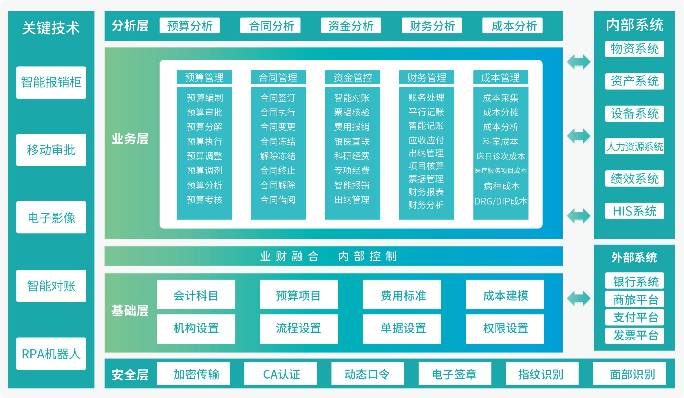 运用物联网、大数据、移动互联等先进技术手段,结合自身在医疗行业的财务管理知识经验,提供医院智慧财务管理解决方案。以“服务全员、数据驱动、流程智能、实时管控、辅助决策”为核心理念,通过医院内部财务管理机制与先进信息技术手段相融合,帮助医院实现智慧财务管理,有效利用资金,促进运营改善。